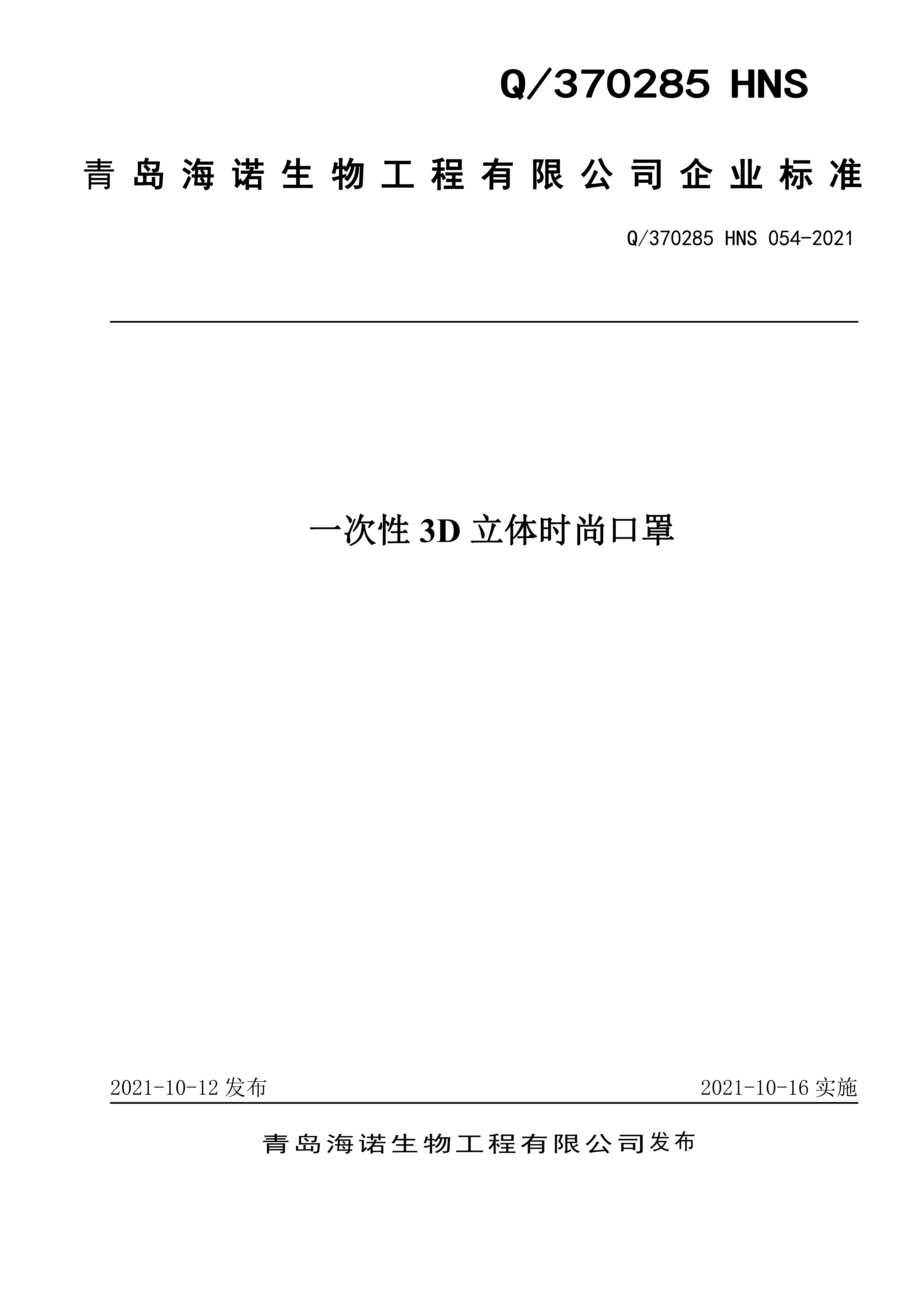 青岛海诺生物工程有限公司企业标准 — 一次性 3D 立体时尚口罩